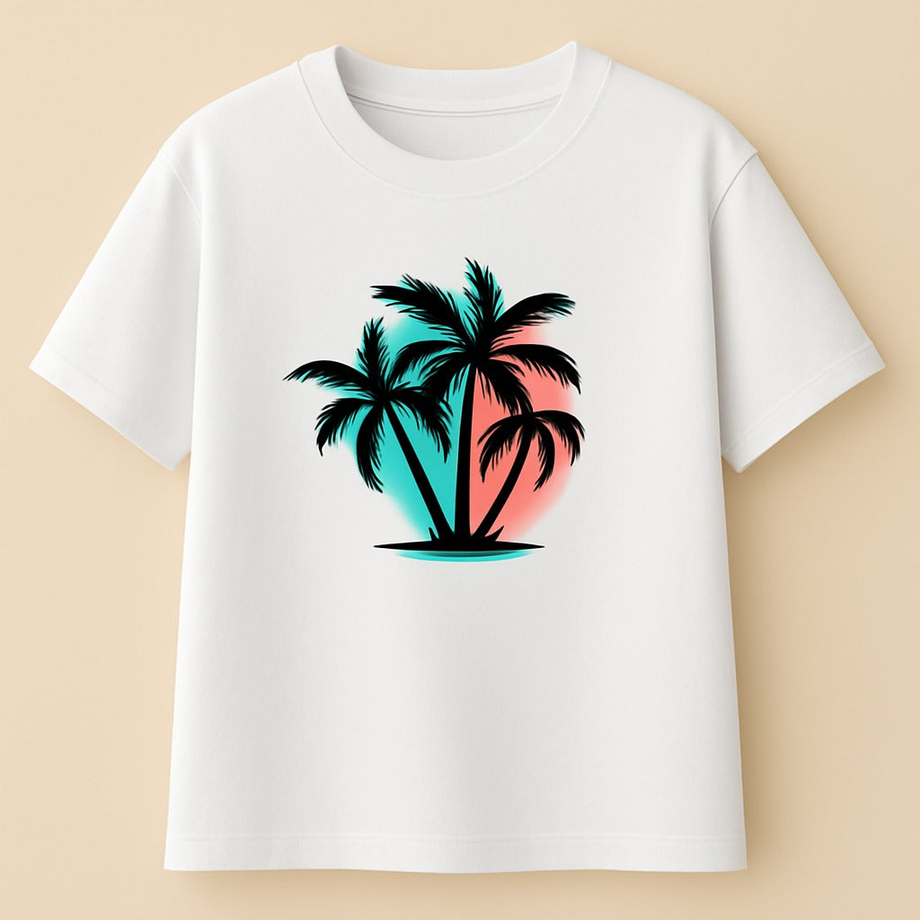 Ease into the vibe with the Sunset Drift Tee—a drop shoulder essential that channels coastal calm and chromatic energy. Featuring twin palm silhouettes washed in turquoise and pink gradients, this piece captures the fleeting magic of golden hour. The circular backdrop evokes a dreamy horizon, blending warmth and coolness in perfect balance.